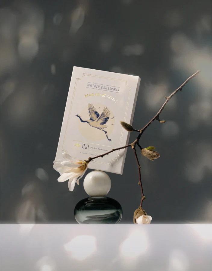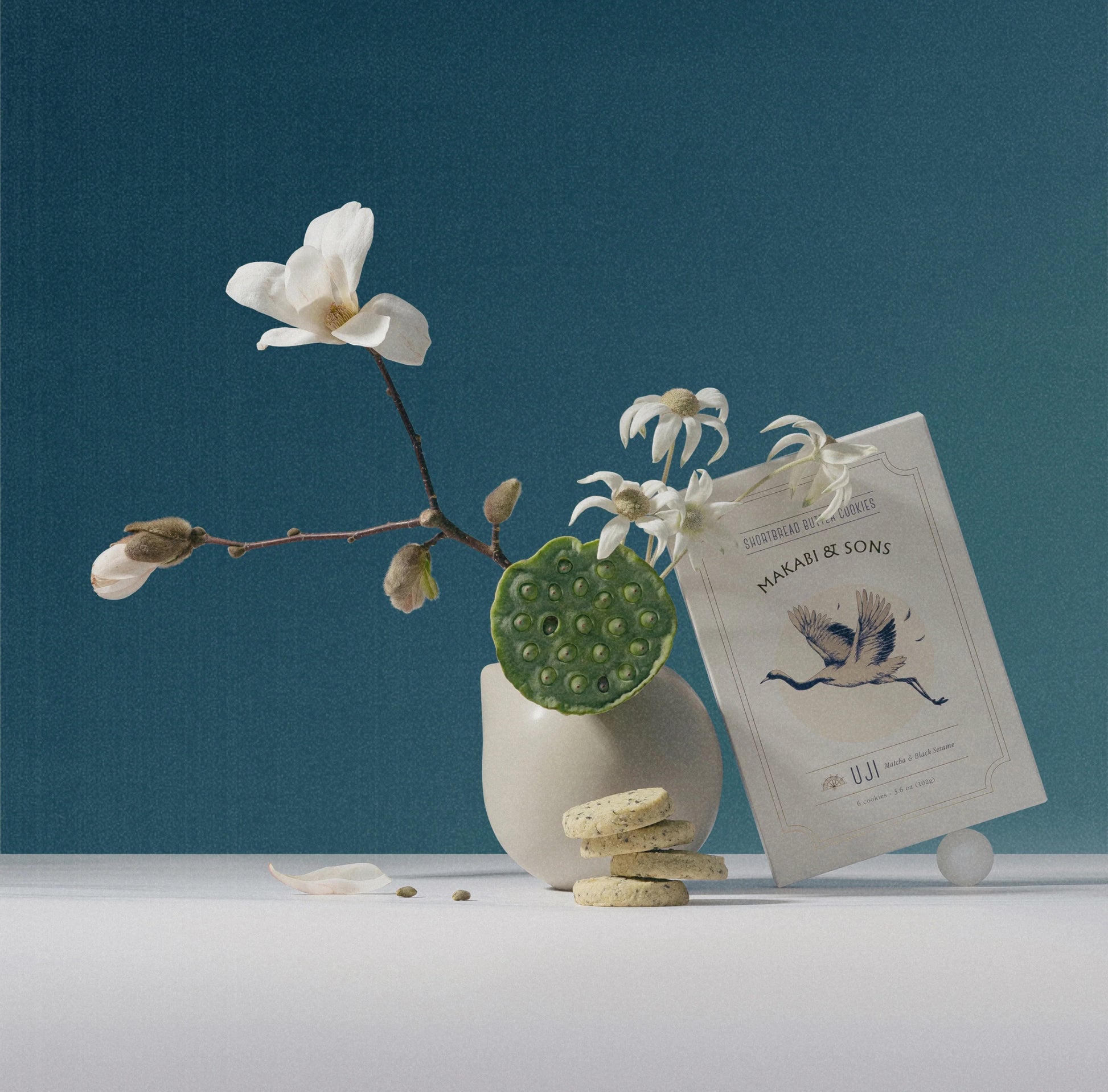 Shortbread butter cookies with rich matcha green tea and toasted black sesame seeds. Delicate gestures performed in a secluded Japanese tea house. A remote teahouse along the banks of river Kamo welcomes peace. Lasting matcha is met by the earthy richness of sesame. Indulgent awareness awaits.